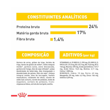 Quirera de arroz, glúten de trigo, farinha de trigo, farelo de glúten de milho*, milho integral moído*, gordura suína, aveia descascada, gordura de frango, óleo de soja refinado*, polpa desidratada de beterraba, óleo branqueado e desodorizado de peixes, fibra de soja*, linhaça integral moída, óleo de borragem, fosfato monocálcico, carbonato de cálcio, cloreto de sódio (sal comum), cloreto de potássio, óxido de magnésio, sorbato de potássio, fruto-oligossacarídeos, extrato de marigold, zeolita, retinol (vitamina A), ácido ascórbico (vitamina C), colecalciferol (vitamina D3), acetato de d-alfa tocoferol (vitamina E), cloridrato de tiamina (vitamina B1), riboflavina (vitamina B2), cloridrato de piridoxina (vitamina B6), cianocobalamina (vitamina B12), ácido nicotínico (niacina), ácido pantotênico, biotina, ácido fólico, cloreto de colina, óxido de zinco, óxido de manganês, sulfato de ferro, sulfato de cobre, iodato de cálcio, levedura enriquecida com selênio, zinco aminoácido quelato, manganês aminoácido quelato, cobre aminoácido quelato, L-lisina, taurina, DL-metionina, L-carnitina, palatabilizante à base de fígado de frango, antioxidante (BHA).