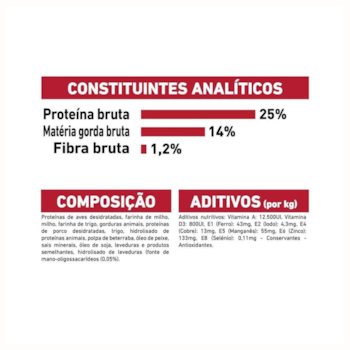 Milho integral moído*, farinha de vísceras de aves, quirera de arroz, farinha de trigo, farinha de torresmo, gordura suína, gordura de frango, polpa de beterraba, óleo de peixe refinado, óleo de soja refinado*, cloreto de sódio (sal comum), cloreto de potássio, carbonato de cálcio, levedura seca de cervejaria, parede celular de levedura (MOS), vitaminas (A, C, D3, E, B1, B2, B6, B12, PP), ácido pantotênico, biotina, ácido fólico, cloreto de colina, sorbato de potássio, sulfato de ferro, sulfato de cobre, óxido de zinco, óxido de manganês, iodato de cálcio, levedura enriquecida com selênio, DL-metionina, taurina, palatabilizante à base de fígado de frango, antioxidante (BHA).