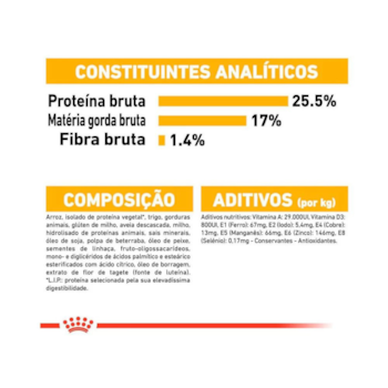 Quirera de arroz, glúten de trigo, milho moído*, farelo de glúten de milho*, gordura suína, grão de aveia, gordura de frango, óleo de soja refinado*, polpa desidratada de beterraba, farinha de trigo, óleo branqueado e desodorizado de peixes, grão de linhaça, fibra de soja*, óleo de borragem, fosfato monocálcico, carbonato de cálcio, cloreto de potássio, cloreto de sódio (sal comum), óxido de magnésio, tripolifosfato de sódio, sorbato de potássio, frutooligossacarídeos, extrato de marigold (Tagetes erecta), zeolita, ésteres de ácido cítrico e ácidos graxos com glicerol, retinol (vitamina A), ácido ascórbico (vitamina C), colecalciferol (vitamina D3), acetato de dl-alfa tocoferol (vitamina E), cloridrato de tiamina (vitamina B1), riboflavina (vitamina B2), cloridrato de piridoxina (vitamina B6), cianocobalamina (vitamina B12), ácido nicotínico (niacina), D-pantotenato de cálcio, biotina, ácido fólico, cloreto de colina, óxido de zinco, óxido de manganês, sulfato de ferro, sulfato de cobre, iodato de cálcio, levedura enriquecida com selênio, zinco aminoácido quelato, manganês aminoácido quelato, cobre aminoácido quelato, L-lisina, taurina, DL-metionina, L-carnitina, hidrolisado de fígado de aves, antioxidante BHA (butilhidroxianisol).