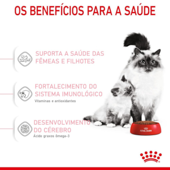 Royal Canin Mother & Baby Cat foi cuidadosamente desenvolvida para atender à alta demanda de energia das fêmeas durante a gestação e lactação, fases em que a nutrição adequada é essencial para garantir a saúde tanto da gata quanto de seus filhotes. Além de fornecer nutrientes essenciais, a fórmula exclusiva permite que os gatinhos tenham um desenvolvimento ideal logo na primeira fase de crescimento. Esta nutrição completa promove o ganho de peso adequado e ajuda a construir uma base saudável para o futuro.