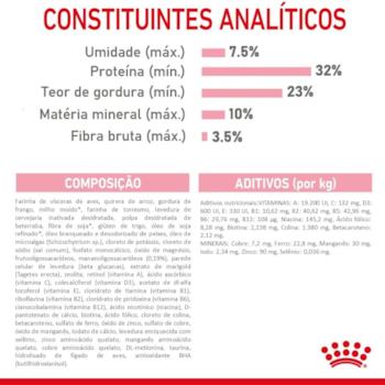 Farinha de vísceras de aves, quirera de arroz, gordura de frango, milho moído*, farinha de torresmo, levedura de cervejaria inativada desidratada, polpa desidratada de beterraba, fibra de soja*, glúten de trigo, óleo de soja refinado*, óleo branqueado e desodorizado de peixes, óleo de microalgas (Schizochytrium sp.), cloreto de potássio, cloreto de sódio (sal comum), fosfato monocálcico, óxido de magnésio, frutooligossacarídeos, mananoligossacarídeos (0,19%), parede celular de levedura (beta glucanas), extrato de marigold (Tagetes erecta), zeolita, retinol (vitamina A), ácido ascórbico (vitamina C), colecalciferol (vitamina D3), acetato de dl-alfa tocoferol (vitamina E), cloridrato de tiamina (vitamina B1), riboflavina (vitamina B2), cloridrato de piridoxina (vitamina B6), cianocobalamina (vitamina B12), ácido nicotínico (niacina), D-pantotenato de cálcio, biotina, ácido fólico, cloreto de colina, betacaroteno, sulfato de ferro, óxido de zinco, sulfato de cobre, óxido de manganês, iodato de cálcio, levedura enriquecida com selênio, zinco aminoácido quelato, manganês aminoácido quelato, cobre aminoácido quelato, DL-metionina, taurina, hidrolisado de fígado de aves, antioxidante BHA (butilhidroxianisol).