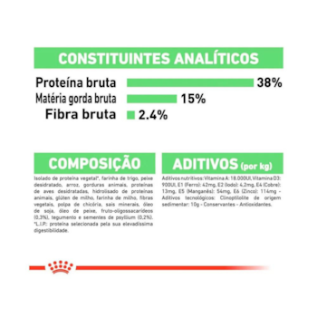 Farinha de vísceras de aves, glúten de trigo, quirera de arroz, farinha de mandioca, farinha de trigo, milho moído*, gordura suína, farelo de glúten de milho*, fibra de soja*, gordura de frango, polpa de chicória seca, óleo branqueado e desodorizado de peixes, óleo de soja refinado*, casca de psyllium (0,5%), cloreto de potássio, fosfato monocálcico, cloreto de sódio (sal comum), bissulfato de sódio, frutooligossacarídeos (0,35%), mananoligossacarídeos, zeolita, retinol (vitamina A), ácido ascórbico (vitamina C), colecalciferol (vitamina D3), acetato de dl-alfa tocoferol (vitamina E), cloridrato de tiamina (vitamina B1), riboflavina (vitamina B2), cloridrato de piridoxina (vitamina B6), cianocobalamina (vitamina B12), ácido nicotínico (niacina), D-pantotenato de cálcio, biotina, ácido fólico, cloreto de colina, sulfato de cálcio, sulfato de ferro, sulfato de cobre, óxido de zinco, óxido de manganês, iodato de cálcio, levedura enriquecida com selênio, zinco aminoácido quelato, manganês aminoácido quelato, cobre aminoácido quelato, taurina, hidrolisado de fígado de aves, antioxidante BHA (butilhidroxianisol).
