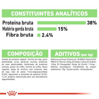 Farinha de vísceras de aves, glúten de trigo, quirera de arroz, farinha de mandioca, farinha de trigo, gordura suína, gordura de frango, farelo de glúten de milho*, fibra de soja*, polpa de chicória seca, casca de psyllium, óleo de peixe refinado, óleo de soja refinado*, sulfato de cálcio, cloreto de potássio, cloreto de sódio (sal comum), fosfato monocálcico, zeolita, fruto-oligossacarídeos, vitaminas (A, E, C, D3, B1, B2, B6, B12, PP), ácido pantotênico, biotina, ácido fólico, cloreto de colina, sulfato de ferro, iodato de cálcio, cobre aminoácido quelato, manganês aminoácido quelato, zinco aminoácido quelato, taurina, palatabilizante à base de fígado de frango, antioxidante (BHA).