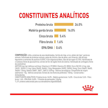 Milho integral moído*, farinha de vísceras de aves, quirera de arroz, farinha de trigo, farelo de glúten de milho*, gordura suína, farinha de torresmo, gordura de frango, glúten de trigo, óleo de peixe refinado, óleo de soja refinado*, óleo de borragem, polpa de chicória seca, casca de psyllium (0,5%), hidrocloreto de glicosamina, sulfato de condroitina, cloreto de potássio, carbonato de cálcio, cloreto de sódio (sal comum), óxido de magnésio, tripolifosfato de sódio, sorbato de potássio, fruto-oligossacarídeos, extrato de marigold, extrato de chá verde, zeolita, vitaminas (A, C, D3, E, B1, B2, B6, B12, PP), ácido pantotênico, biotina, ácido fólico, cloreto de colina, sulfato de ferro, sulfato de cobre, óxido de zinco, óxido de manganês, iodato de cálcio, levedura enriquecida com selênio, zinco aminoácido quelato, manganês aminoácido quelato, cobre aminoácido quelato, DL-metionina, taurina, L-carnitina, palatabilizante à base de fígado de frango, antioxidante (BHA).