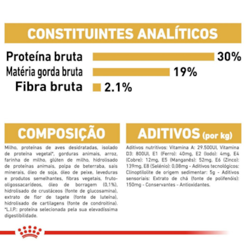 Quirera de arroz, farinha de vísceras de aves, milho integral moído*, farinha de torresmo, farelo de glúten de milho*, gordura suína, gordura de frango, polpa de beterraba, óleo de soja refinado*, fibra de soja*, glúten de trigo, óleo de peixe refinado, levedura seca de cervejaria, óleo de borragem (0,1%), cloreto de potássio, carbonato de cálcio, cloreto de sódio (sal comum), óxido de magnésio, hidrocloreto de glicosamina, sulfato de condroitina, tripolifosfato de sódio, sorbato de potássio, fruto-oligossacarídeos, extrato de marigold, extrato de chá verde, zeolita, vitaminas (A, C, D3, E, B1, B2, B6, B12, PP), ácido pantotênico, biotina, ácido fólico, cloreto de colina, sulfato de ferro, sulfato de cobre, sulfato de cálcio, óxido de zinco, óxido de manganês, iodato de cálcio, levedura enriquecida com selênio, zinco aminoácido quelato, manganês aminoácido quelato, cobre aminoácido quelato, DL-metionina, L-lisina, tirosina, taurina, L-cistina, L-carnitina, palatabilizante à base de fígado de frango, antioxidante (BHA).
