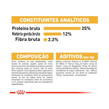 Quirera de arroz, farinha de vísceras de aves, milho integral moído*, farelo de glúten de milho*, gordura de frango, polpa de chicória seca, farinha de torresmo, gordura suína, fibra de soja*, glúten de trigo, óleo de peixe refinado, óleo de soja refinado*, casca de psyllium, óleo de borragem, cloreto de sódio (sal comum), carbonato de cálcio, cloreto de potássio, óxido de magnésio, hidrocloreto de glicosamina, sulfato de condroitina, tripolifosfato de sódio, citrato de potássio, sorbato de potássio, fruto-oligossacarídeos, extrato de marigold, extrato de chá verde, zeolita, vitaminas (A, C, D3, E, B1, B2, B6, B12, PP), ácido pantotênico, biotina, ácido fólico, cloreto de colina, sulfato de ferro, sulfato de cobre, sulfato de cálcio, óxido de manganês, óxido de zinco, iodato de cálcio, levedura enriquecida com selênio, cobre aminoácido quelato, manganês aminoácido quelato, zinco aminoácido quelato, tirosina, DL-metionina, L-lisina, taurina, L-carnitina, palatabilizante à base de fígado de frango, antioxidante (BHA).