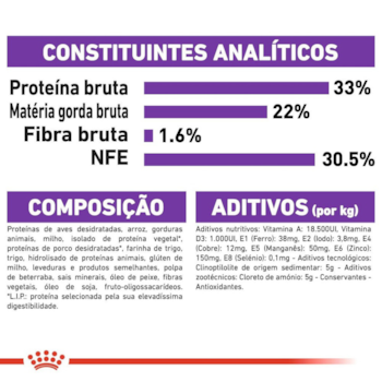 - Alta densidade energética, permitindo refeições menores e reduzindo o esforço digestivo, ideal para gatos com sensibilidade digestiva;
