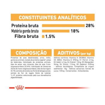 Farinha de vísceras de aves, quirera de arroz, milho integral moído*, polpa de beterraba, gordura suína, farinha de torresmo, gordura de frango, óleo de peixe refinado, óleo de soja refinado*, óleo de borragem (0,1%), cloreto de potássio, fosfato monocálcico, cloreto de sódio (sal comum), tripolifosfato de sódio, sorbato de potássio, extrato de yucca, fruto-oligossacarídeos (0,35%), parede celular de levedura (MOS), parede celular de levedura (betaglucano), extrato de marigold, zeolita, vitaminas (A, C, D3, E, B1, B2, B6, B12, PP), ácido pantotênico, biotina, ácido fólico, cloreto de colina, betacaroteno, sulfato de ferro, sulfato de cobre, óxido de zinco, óxido de manganês, iodato de cálcio, levedura enriquecida com selênio, zinco aminoácido quelato, manganês aminoácido quelato, cobre aminoácido quelato, tirosina, DL-metionina, taurina, L-carnitina, palatabilizante à base de fígado de frango, antioxidante (BHA).