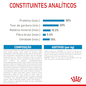 Farinha de vísceras de aves, quirera de arroz, gordura de frango, milho moído*, gordura suína, farinha de torresmo, polpa desidratada de beterraba, glúten de trigo, óleo de soja refinado*, óleo branqueado e desodorizado de peixes, óleo de microalgas (Schizochytrium sp.), fosfato moconálcico, cloreto de potássio, cloreto de sódio (sal comum), carbonato de cálcio, butirato de sódio, sorbato de potássio, frutooligossacarídeos, mananoligossacarídeos (0,2%), parede celular de levedura (beta glucanas), extrato de marigold, zeolita, retinol (vitamina A), ácido ascórbico (vitamina C), colecalciferol (vitamina D3), acetato de dl-alfa tocoferol (vitamina E), cloridrato de tiamina (vitamina B1), riboflavina (vitamina B2), cloridrato de piridoxina (vitamina B6), cianocobalamina (vitamina B12), ácido nicotínico (niacina), D-pantotenato de cálcio, ácido fólico, biotina, cloreto de colina, betacaroteno, sulfato de ferro, sulfato de cobre, óxido de manganês, óxido de zinco, iodato de cálcio, levedura enriquecida com selênio, zinco aminoácido quelato, manganês aminoácido quelato, cobre aminoácido quelato, taurina, DL-metionina, L-lisina, L-treonina, hidrolisado de fígado de aves, antioxidante BHA (butilhidroxianisol).