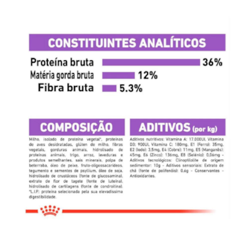 Milho moído*, farinha de vísceras de aves, fibra de soja*, farinha de torresmo, quirera de arroz, glúten de trigo, gordura de frango, levedura de cervejaria inativada desidratada, polpa desidratada de beterraba, farelo de glúten de milho*, óleo branqueado e desodorizado de peixes, casca de psyllium, óleo de soja refinado*, hidrocloreto de glicosamina, sulfato de condroitina, cloreto de sódio (sal comum), cloreto de potássio, citrato de potássio, sulfato de cálcio, frutooligossacarídeos, zeolita, extrato de marigold (Tagetes erecta), extrato de chá verde (Camélia sinenses), retinol (vitamina A), ácido ascórbico (vitamina C), colecalciferol (vitamina D3), acetato de dl-alfa tocoferol (vitamina E), cloridrato de tiamina (vitamina B1), riboflavina (vitamina B2), cloridrato de piridoxina (vitamina B6), cianocobalamina (vitamina B12), ácido nicotínico (niacina), D-pantotenato de cálcio, biotina, ácido fólico, cloreto de colina, sulfato de ferro, sulfato de cobre, óxido de manganês, óxido de zinco, iodato de cálcio, levedura enriquecida com selênio, cobre aminoácido quelato, manganês aminoácido quelato, zinco aminoácido quelato, DL-metionina, taurina, L-carnitina, hidrolisado de fígado de aves, antioxidante BHA (butilhidroxianisol).
