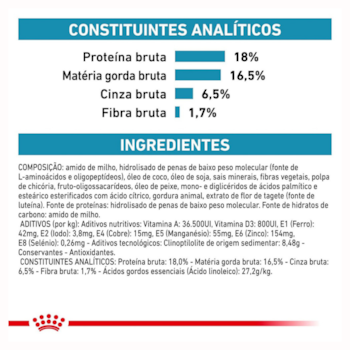 Amido de milho, hidrolisado de penas de baixo peso molecular (fonte de L-aminoácidos e oligopeptídeos), óleo de coco, óleo de soja, sais minerais, fibras vegetais, polpa de chicória, fruto-oligossacarídeos, óleo de peixe, mono- e diglicéridos de ácidos palmítico e esteárico esterificados com ácido cítrico, gordura animal, extrato de flor de tagete (fonte de luteína). Fonte de proteínas: hidrolisado de penas de baixo peso molecular. Fonte de hidratos de carbono: amido de milho.