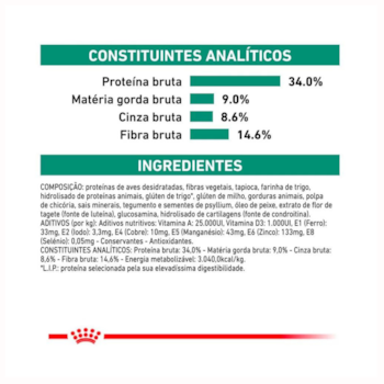 Farinha de vísceras de aves, aveia descascada, glúten de trigo, farelo de glúten de milho*, casca de ervilha, farinha de mandioca, proteína isolada de soja*, gordura de frango, polpa de chicória seca, óleo de peixe refinado, casca de psyllium, óleo de soja refinado*, cloreto de potássio, cloreto de sódio (sal comum), citrato de potássio, fruto-oligossacarídeos, extrato de marigold, vitaminas (A, C, D3, E, B1, B2, B6, B12, PP), ácido pantotênico, biotina, ácido fólico, cloreto de colina, sulfato de ferro, sulfato de cobre, sulfato de cálcio, óxido de zinco, óxido de manganês, iodato de cálcio, levedura enriquecida com selênio, zinco aminoácido quelato, manganês aminoácido quelato, cobre aminoácido quelato, taurina, L-arginina, L-carnitina, palatabilizante à base de fígado de frango, antioxidante (BHA).