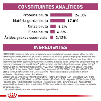 Quirera de arroz, milho integral moído*, farinha de torresmo, fibra de soja*, gordura de frango, farinha de trigo, farelo de glúten de milho*, gordura suína, polpa de chicória seca, óleo de peixe refinado, glúten de trigo, carbonato de cálcio, óleo de soja refinado*, cloreto de potássio, casca de psyllium, citrato de potássio, cloreto de sódio (sal comum), levedura seca de cervejaria, zeolita, fruto-oligossacarídeos, extrato de marigold, vitaminas (A, E, C, D3, B1, B2, B6, B12, PP), ácido pantotênico, biotina, ácido fólico, cloreto de colina, sulfato de ferro, sulfato de cobre, óxido de manganês, óxido de zinco, iodato de cálcio, levedura enriquecida com selênio, cobre aminoácido quelato, manganês aminoácido quelato, zinco aminoácido quelato, DL-metionina, taurina, L-lisina, palatabilizante à base de fígado de frango, antioxidante (BHA).