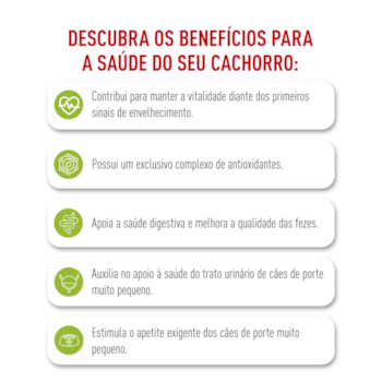 Alimento completo para cães - Especial para cães maduros de raças muito pequenas (até 4kg) - Mais de 8 anos. O teor nutricional desta fórmula ajuda a manter a vitalidade em cães de raça muito pequena que apresentem os primeiros sinais de envelhecimento. Contém um complexo exclusivo de antioxidantes. Os Cães de raça muito pequena têm maior propensão à obstipação. A ingestão equilibrada de fibras (incluindo Psyllium) ajuda a facilitar o trânsito intestinal e contribui para uma boa qualidade das fezes graças à elevada digestibilidade das proteínas L.I.P. Ajuda a suportar um sistema urinário saudável em cães de raças muito pequenas. Este pequeno croquete foi desenvolvido para estar perfeitamente adaptado à mandíbula miniatura de cães com menos de 4 kg. A sua fórmula exclusiva também ajuda a estimular o apetite caprichoso de cães de raça muito pequena.