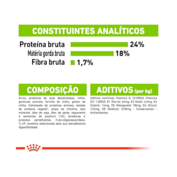 arroz, farinha de milho, proteínas de aves desidratadas, gorduras animais, milho, glúten de milho, hidrolisado de proteínas animais, isolado de proteína vegetal*, polpa de chicória, sais minerais, óleo de soja, óleo de peixe, leveduras e produtos semelhantes, tegumento e sementes de psyllium (1%), fruto-oligossacarídeos, óleo de borragem, extrato de flor de tagete (fonte de luteína).
