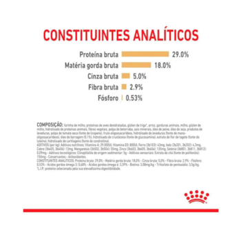 Quirera de arroz, farinha de vísceras de aves, glúten de trigo, casca de ervilha, gordura de frango, gordura suína, polpa de beterraba, óleo de soja refinado*, óleo de peixe refinado, sulfato de cálcio, cloreto de potássio, cloreto de sódio (sal comum), hidrocloreto de glicosamina, levedura seca de cervejaria, fruto-oligossacarídeos, extrato de marigold, vitaminas (A, E, C, D3, B1, B2, B6, B12, PP), ácido pantotênico, biotina, ácido fólico, cloreto de colina, sulfato de ferro, sulfato de cobre, óxido de manganês, óxido de zinco, iodato de cálcio, levedura enriquecida com selênio, cobre aminoácido quelato, manganês aminoácido quelato, zinco aminoácido quelato, DL-metionina, taurina, palatabilizante à base de fígado de frango, antioxidante (BHA).