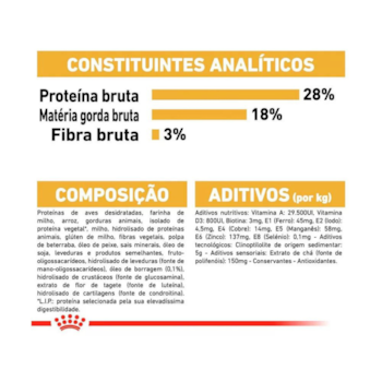 Milho integral moído*, farinha de vísceras de aves, quirera de arroz, farelo de glúten de milho*, gordura de frango, farinha de torresmo, gordura suína, polpa de beterraba, fibra de soja*, glúten de trigo, óleo de peixe refinado, óleo de soja refinado*, levedura seca de cervejaria, óleo de borragem (0,1%), carbonato de cálcio, cloreto de potássio, cloreto de sódio (sal comum), óxido de magnésio, hidrocloreto de glicosamina, sulfato de condroitina, tripolifosfato de sódio, sorbato de potássio, fruto-oligossacarídeos, parede celular de levedura (MOS), extrato de marigold, extrato de chá verde, zeolita, vitaminas (A, C, D3, E, B1, B2, B6, B12, PP), ácido pantotênico, biotina, ácido fólico, cloreto de colina, sulfato de ferro, sulfato de cobre, óxido de zinco, óxido de manganês, iodato de cálcio, levedura enriquecida com selênio, zinco aminoácido quelato, manganês aminoácido quelato, cobre aminoácido quelato, DL-metionina, tirosina, taurina, L-carnitina, palatabilizante à base de fígado de frango, antioxidante (BHA).
