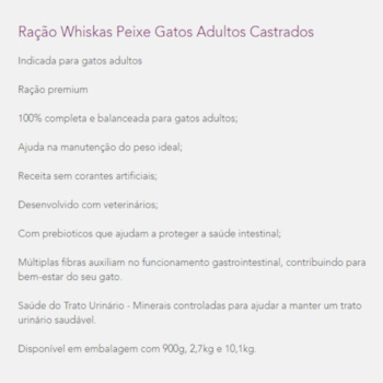A Ração Whiskas® para gatos adultos peixe é um alimento desenvolvido para gatos com alta palatabilidade para auxiliar no desenvolvimento de seu gato.