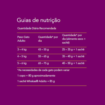 A Ração Whiskas® em sua fórmula contem nutrientes balanceados e antioxidantes que auxiliam no envelhecimento saudável, possui delicicrocs que por conta de sua estrutura crocante facilita a mastigação para gatos.
