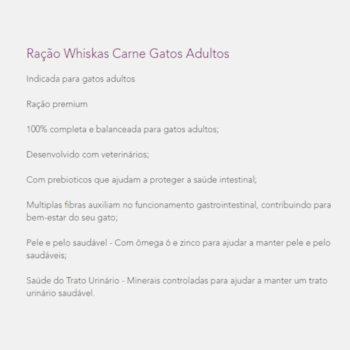 A Ração Whiskas® para gatos adultos carne é um alimento desenvolvido para gatos com alta palatabilidade para auxiliar no desenvolvimento de seu gato.