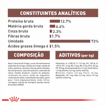 Água, vísceras de frango, carne mecanicamente separada de frango, miúdos de frango, amido de milho, gelatina, óleo de peixe refinado, óleo de girassol, celulose, ovo em pó, caseinato de cálcio, cloreto de potássio, fosfato bicálcico, carbonato de cálcio, cloreto de sódio (sal comum), óxido de magnésio, casca de psyllium, extrato de leveduras (MOS), goma guar, ácido cítrico, fruto-oligossacarídeos, extrato de marigold, carragena, tripolifosfato de sódio, vitaminas (C, D3, E, B1, B2, B6, B12), niacina, ácido pantotênico, ácido fólico, biotina, cloreto de colina, carbonato de sódio, sulfato de cálcio, sulfato de zinco, sulfato de ferro, sulfato de manganês, sulfato de cobre, iodato de cálcio, zinco aminoácido quelato, manganês aminoácido quelato, cobre aminoácido quelato, taurina, metionina.
