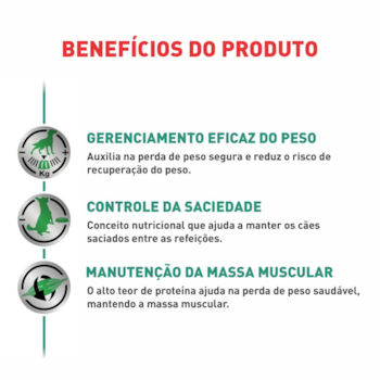 Auxilia na perda de peso segura e reduz o risco de recuperação do peso com conceito nutricional que ajuda a manter os cães saciados entre as refeições, possui um alto teor de proteína ajuda a manter a massa muscular durante o período de perda de peso e esta dieta promove um ambiente urinário desfavorável à formação de urólitos de estruvita e de oxalato de cálcio.