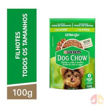 Durante os primeiros meses, um filhote vive um ritmo intenso de crescimento e descoberta. Para acompanhar essa demanda, a ração úmida Dog¿Chow ExtraLife foi desenvolvida como alimento 100% completo e balanceado, ideal para cães filhotes de todos os portes. Com sabor carne e textura macia, esse sachê oferece praticidade e nutrientes de alta qualidade, sem a necessidade de complementação com ração seca.