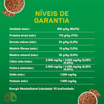Cada sachê concentra alta umidade e densidade energética adequada à rotina do filhote. Apesar de ser úmida, sua composição é balanceada para fornecer proteínas, gorduras e minerais nas proporções corretas, sem comprometer o controle de peso. A combinação entre proteína bruta, extrato etéreo e minerais como cálcio e fósforo garante suporte estrutural e energético de qualidade.