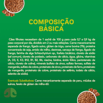 A composição do sachê inclui carne mecanicamente separada de frango, fígado suíno e pequenas quantidades de carne bovina, além de proteína concentrada de soja e ingredientes fontes de energia como amido e dextrose. A alga Schizochytrium sp. aparece como fonte de ômega-3. Esses componentes trabalham juntos para fornecer nutrientes essenciais desde a formação até o fortalecimento da imunidade.