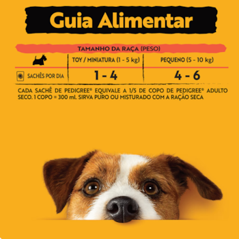 Seus pedacinhos suculentos, proporcionará ao seu cãozinho uma deliciosa experiência. A textura macia da Ração Úmida Sache Pedigree é ideal para cães de todas as idades e raças. É uma maneira prática e fácil de alimentar o seu cão, além de auxiliar na hidratação.