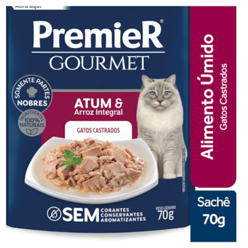 O Sachê PremieR Gourmet gatos Castrados, atum e arroz integral é um alimento Super Premium desenvolvido para gatos, garantindo melhor saciedade e a dose certa de nutrientes e sabor inigualável.