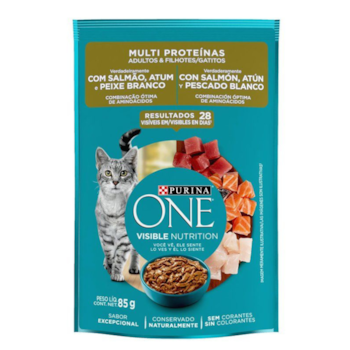 Ração Úmida Sachê Purina One para Gatos Adultos e Filhotes sabor Salmão, Atum e Peixe Branco 85gr