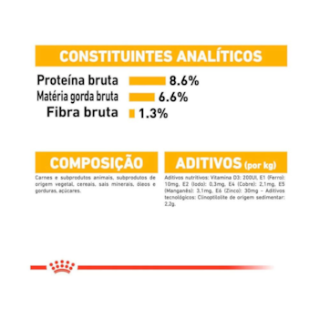 Água, vísceras de frango, carne mecanicamente separada de frango, miúdos de frango, farinha de arroz, óleo de peixe refinado, celulose, polpa de beterraba, carbonato de cálcio, cloreto de potássio, óxido de magnésio, tripolifosfato de sódio, carbonato de sódio, carragena, goma alfarroba, goma xantana, zeolita, ácido cítrico, extrato de marigold, corante caramelo, vitaminas (C, D3, E, B1, B2, B6, B12, PP), pantotenato de cálcio, ácido fólico, biotina, cloreto de colina, sulfato de zinco, sulfato de ferro, sulfato de manganês, sulfato de cobre, iodato de cálcio, zinco aminoácido quelato, manganês aminoácido quelato, cobre aminoácido quelato, taurina, DL-metionina.