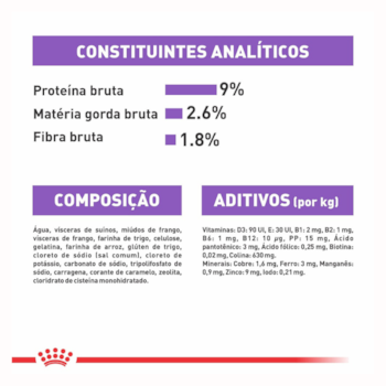 Água, vísceras de suínos, miúdos de frango, vísceras de frango, farinha de trigo, celulose, gelatina, farinha de arroz, glúten de trigo, cloreto de sódio (sal comum), cloreto de potássio, carbonato de sódio, tripolifosfato de sódio, carragena, corante de caramelo, zeolita, cloridrato de cisteína monohidratado, vitaminas (D3, E, B1, B2, B6, B12), niacina, pantotenato de cálcio, ácido fólico, biotina, cloreto de colina, sulfato de zinco, sulfato de ferro, sulfato de cobre, iodato de cálcio, sulfato de manganês, cobre aminoácido quelato, manganês aminoácido quelato, zinco aminoácido quelato, metionina, taurina, L-carnitina.