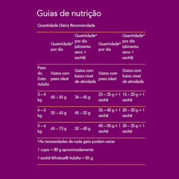 A Ração Whiskas® em sua fórmula contem nutrientes balanceados para controle e perda de peso, auxilia no trato urinário além de controle e combate a formação de bolas de pelo.