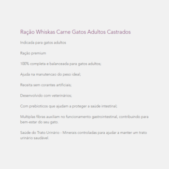 A Ração Whiskas® para gatos adultos castrados carne é um alimento desenvolvido para gatos com alta palatabilidade para auxiliar no desenvolvimento de seu gato.