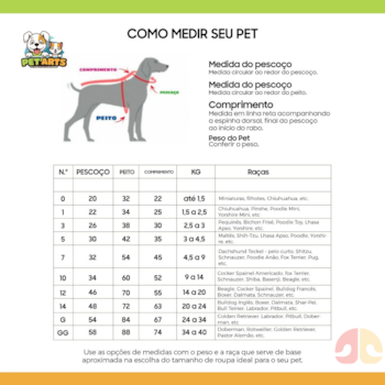 Para que a roupinha tenha um caimento perfeito no seu pet, é fundamental escolher o tamanho correto. A Pet Arts disponibiliza uma tabela de medidas detalhada, considerando as dimensões do pescoço, tórax e comprimento do pet, além do peso aproximado.