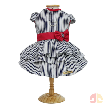 • Design: O vestido Lady Pet Arts possui estampa listrada, lacinho na cintura, saia drapeada em camadas e mangas princesa, proporcionando um visual sofisticado e encantador.