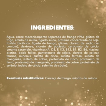 Água, carne mecanicamente separada de frango(9%), glúten de trigo, amido de milho, fígado de suíno, proteína concentrada de soja, fosfato bicálcico, fígado de frango, glicina, cloreto de sódio (sal comum), dextrose, cloreto de potássio, carbonato de cálcio, corantecaramelo, vitaminas (A, D3, E, K3, B12, B1, B2, B6, niacina, biotina, ácido fólico, pantotenato de cálcio,cloreto de colina), taurina, minerais (sulfato de zinco, sulfato ferroso, sulfato de manganês, sulfato de cobre, proteinato de zinco, proteinato de ferro,proteinato de manganês, proteinato de cobre, proteinato de selênio, iodato de cálcio, selenito de sódio). Eventuais substitutivos: carcaça de frango,miúdos de suínos.