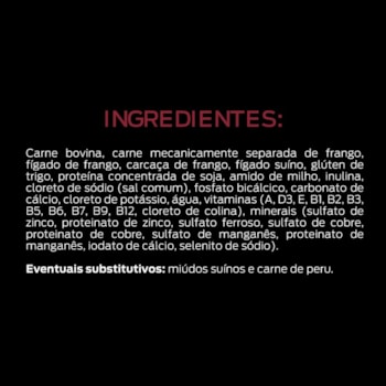 Carne bovina, carne mecanicamente separada de frango, fígado de frango, carcaça de frango, fígado suíno, glúten de trigo, proteína concentrada de soja, amido de milho, inulina, cloreto de sódio (sal comum), fosfato bicálcico, carbonato de cálcio, cloreto de potássio, água, vitaminas (A, D3, E, B1, B2, B3, B5, B6, B7, B9, B12, cloreto de colina), minerais (sulfato de zinco, proteinato de zinco, sulfato ferroso, sulfato de cobre, proteinato de cobre, sulfato de manganês, proteinato de manganês, iodato de cálcio, selenito de sódio). Eventuais substitutivos: carne de peru e miúdos suínos.