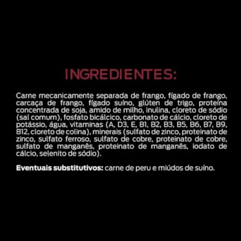 Carne mecanicamente separada de frango, fígado de frango, carcaça de frango, fígado suíno, glúten de trigo, proteína concentrada de soja, amido de milho, inulina, cloreto de sódio (sal comum), fosfato bicálcico, carbonato de cálcio, cloreto de potássio, água, vitaminas (A, D3, E, B1, B2, B3, B5, B6, B7, B9, B12, cloreto de colina), minerais (sulfato de zinco, proteinato de zinco, sulfato ferroso, sulfato de cobre, proteinato de cobre, sulfato de manganês, proteinato de manganês, iodato de cálcio, selenito de sódio). Eventuais substitutivos: carne de peru e miúdos de suíno.