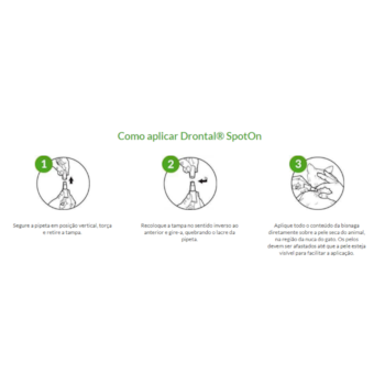 Segure a pipeta em posição vertical, torça e retire a tampa. Recoloque a tampa no sentido inverso ao anterior e gire-a, quebrando o lacre da pipeta. Afaste os pelos do pet até que sua pele esteja visível e aplique todo o conteúdo do Vermífugo Drontal Spot On na nuca do gato e o produto começará a combater rapidamente os parasitas. É importante que os pelos estejam secos.