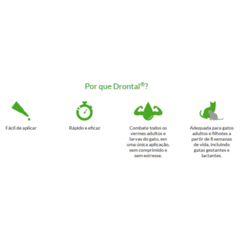 O Vermífugo Drontal Spot On é uma medicação com ação contra verminoses intestinais em gatos. Combate todos os vermes adultos e larvas do gato, em uma única e fácil aplicação na nuca do pet.