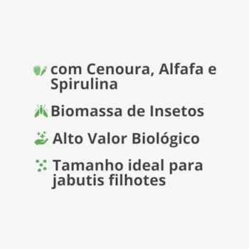 A ração é enriquecida com ingredientes naturais cuidadosamente selecionados, como alfafa, cenoura e spirulina, conferindo uma grande atratividade ao alimento. Essa combinação não apenas atende às necessidades nutricionais, mas também torna a alimentação dos jabutis uma experiência prazerosa.