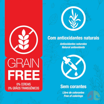 Carnes selecionadas (min. 16% – carne de frango, carne mecanicamente separada e figado de frango), farinha de vísceras de aves, farinha e fécula de mandioca (mín. 15%), farinha de ervilha, amido de batata, óleo de vísceras de aves, óleo de salmão, palatabilizante de visceras de suíno e frango, fibra de cana de açúcar, frutas e vegetais desidratadas (manga, maçã, cenoura, tomate), polpa de beterraba, semente de linhaça, cloreto de sódio, farinha de algas Schizochytrium sp., prebióticos (parede celular de levedura, frutooligossacarídeos e inulina), zeólita, extrato de yucca (0,04%), colágeno hidrolisado (0,05%), sulfato de condroitina (0,01%), sulfato de glucosamina (0,03%), vitaminas (A, D3, E, K3, C, B1, B2, B6, B12, biotina, pantotenato de cálcio, ácido fólico, niacina, cloreto de colina), minerais (sulfato de ferro, sulfato de cobre, iodato de cálcio, cloreto de potássio, proteinato de zinco, óxido de zinco, óxido de manganês, proteinato de selênio, selenito de sódio), lisina, metionina, taurina, ácido propiônico, extratos de chá verde, alecrim e cúrcuma (0,01%), concentrado de tocoferóis (antioxidante natural) 0,01%).