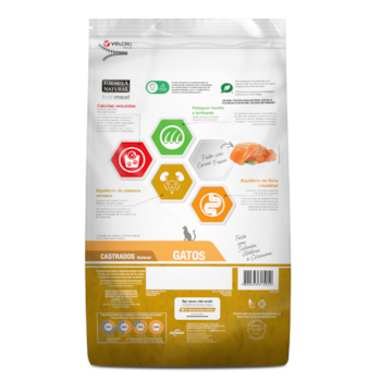 Desenvolvida por médicos veterinários, a linha Fórmula Natural Fresh Meat utiliza os conceitos mais avançados da nutrição de cães e gatos. Naturalmente saborosa e nutritiva, possui como grande diferencial a utilização de carne fresca e fontes especiais de carboidratos, fibras, vitaminas e minerais, como as frutas e vegetais. É uma linha completa que oferece versões com cuidados específicos para diferentes necessidades e estágios de vida. Fórmula Natural Fresh Meat Gatos Castrados Sabor Salmão oferece um teor menor de calorias e mais fibras para gatos adultos castrados.