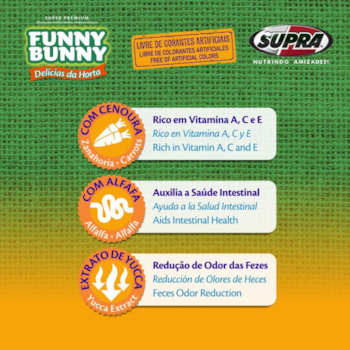 O Ração Funny Bunny Delícias da Horta para Coelhos e Roedores é um alimento exclusivo para coelhos de estimação e pequenos roedores, elaborado a partir de vegetais nobres como a alfafa verde, que aporta vitaminas e fibras essenciais para a digestão, visão e eliminação de bolas de pelo e cenoura desidratada, cujo aporte de caroteno e vitamina C favorece a calcificação dos ossos, auxilia na visão e atua como antioxidante natural.