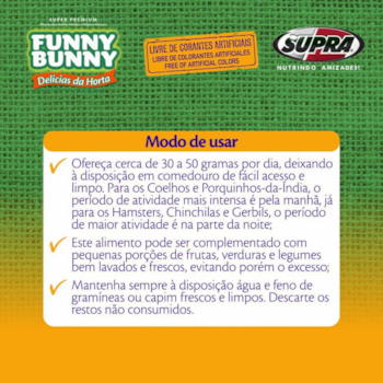 O Ração Funny Bunny Delícias da Horta para Coelhos e Roedores é um alimento exclusivo para coelhos de estimação e pequenos roedores, elaborado a partir de vegetais nobres como a alfafa verde, que aporta vitaminas e fibras essenciais para a digestão, visão e eliminação de bolas de pelo e cenoura desidratada, cujo aporte de caroteno e vitamina C favorece a calcificação dos ossos, auxilia na visão e atua como antioxidante natural.