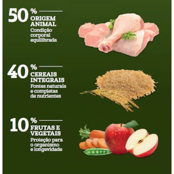 Seleção de Ingredientes de Origem Animal, mín. 50% (dos quais mín. 16% são Carnes Selecionadas: Carne Mecanicamente Separada de Frango e Fígado de Frango; Farinha de Vísceras de Aves, Farinha de Torresmo, Ovo em Pó, Óleo de Vísceras de Aves, Gordura Suína, Óleo de Peixe Refinado, Hidrolisado de Fígado Ave e Suíno). Seleção de Cereais Integrais, mín. 40% (Arroz Integral, Grão de Aveia, Cevada em Grão, Grão de Sorgo). Seleção de Vegetais, Frutas, Vitaminas, Minerais e Ingredientes Funcionais, máx. 10% (dos quais máx. 5% são Vegetais e Frutas Selecionados: Ervilha, Brócolis Desidratado, Espinafre Desidratado, Cenoura Desidratada, Mirtilo Desidratado “Blueberry”, Amora Desidratada, Maçã Desidratada, Manga Desidratada, Polpa de Beterraba, Farinha da Alga Schizochytrium sp., Semente de Psyllium, Casca de Aveia Moída, Levedura Seca de Cervejaria, Óleo de Linhaça; Cloreto de Potássio, Carbonato de Cálcio, Sulfato de Condroitina, Sulfato de Glicosamina, Parede Celular de Levedura Fonte de Beta-Glucanos, Hexametafosfato de Sódio, Extrato de Yucca, L-Lisina, Taurina, DL-Metionina, L-Carnitina, Propionato de Cálcio, Sorbato de Potássio, Aditivos Prebióticos: Inulina e Parede Celular de Levedura Fonte de Mananoligossacarídeos; Antioxidantes Naturais: Extrato de Alecrim e Concentrado de Tocoferóis; Aditivo Adsorvente: Parede Celular de Levedura e Bentonita; Vitaminas: A, D3, E, K3, C, B1, B2, B6, B12, Pantotenato de Cálcio, Ácido Fólico, Ácido Nicotínico, Biotina, Cloreto de Colina; Minerais: Sulfato de Zinco, Sulfato de Ferro, Sulfato de Manganês, Iodato de Cálcio; Minerais Quelatados: Proteinato de Manganês, Levedura Enriquecida com Selênio, Proteinato de Zinco, Proteinato de Cobre).