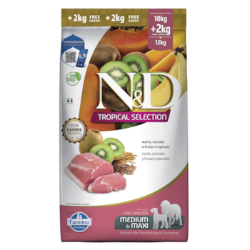 Ração N&D Tropical Selection Cães Adultos 10kg + 2kg Grátis Porte Médio e Grande Sabor Suíno, Cereais e Frutas Tropicais
